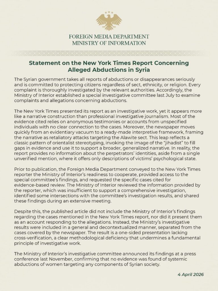نشرت إدارة الإعلام الأجنبي بوزارة الإعلام بيانا في 4 ابريل/ نيسان 2026 بشأن تقرير “مزاعم الاختطاف”في نيويورك تايمز، تأخذ الحكومة السورية جميع التقارير المتعلقة بالاختطاف أو الاختفاء على محمل الجد، وهي ملتزمة بحماية المواطنين بغض النظر عن الطائفة أو العرق أو الدين، ويتم التحقيق في كل شكوى بدقة من قبل السلطات المختصة. وبناءً على ذلك، أنشأت وزارة الداخلية لجنة تحقيق خاصة في يوليو الماضي لفحص الشكاوى والادعاءات المتعلقة بالاختطاف.