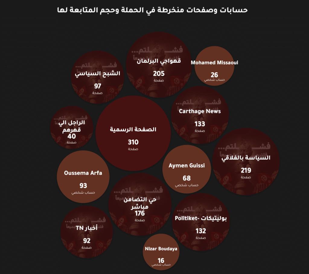 يتضمن التحقيق تحليل المنشورات حول هؤلاء المهاجرين، عبر 13 حساباً وصفحة، هي حسابات كل من: أسامة عرفة Oussema Arfa (وهو مرتبط بالصفحة الرسمية الموثقة لأسامة عرفة) الذي يحمل اسم Ben Arfa، ونزار بوديه Nizar Boudaya، ومحمد الميساوي Mohamed Missaoui، وأيمن ڨيسي Aymen Guissi، بالإضافة إلى الصفحات: قهواجي البرلمان، والصفحة الرسمية، وبوليتيكات Politiket، والراجل اللي قهرهم، وحي التضامن مباشر، والشبح السياسي، والسياسة بالفلاقي، وCarthage news، وأخبار TN.