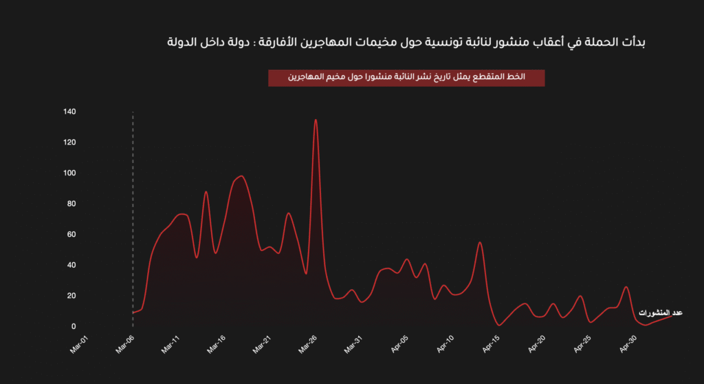 في السادس من آذار/مارس 2025، زارت النائبة التونسية، فاطمة المسدي، مخيماً للمهاجرين في منطقة العامرة بمحافظة صفاقس، جنوبي البلاد. يشكل المخيم نقطة تجمع للمهاجرين من جنسيات إفريقية مختلفة. بعد الزيارة، نشرت فاطمة منشوراً على حسابها بفيسبوك، مصحوباً بصور من المخيم مرفقة بعنوان “دولة داخل الدولة”. لاقى المنشور انتشاراً واسعاً، وأعقبته حملات مضللة على المنصة ذاتها؛ للتحريض ضد المهاجرين من جنوب الصحراء الإفريقية.