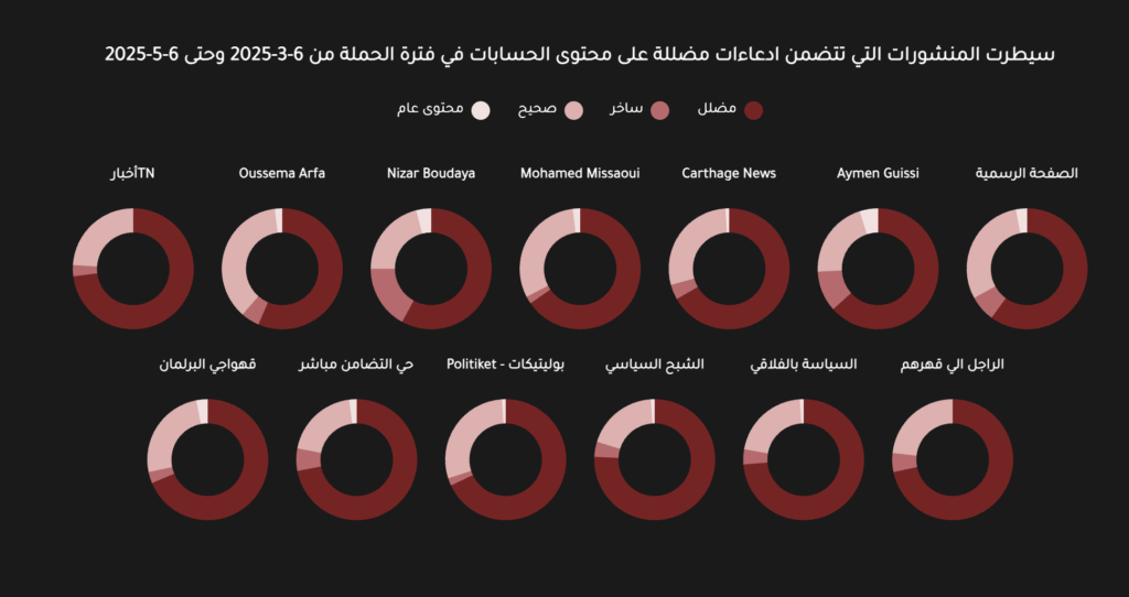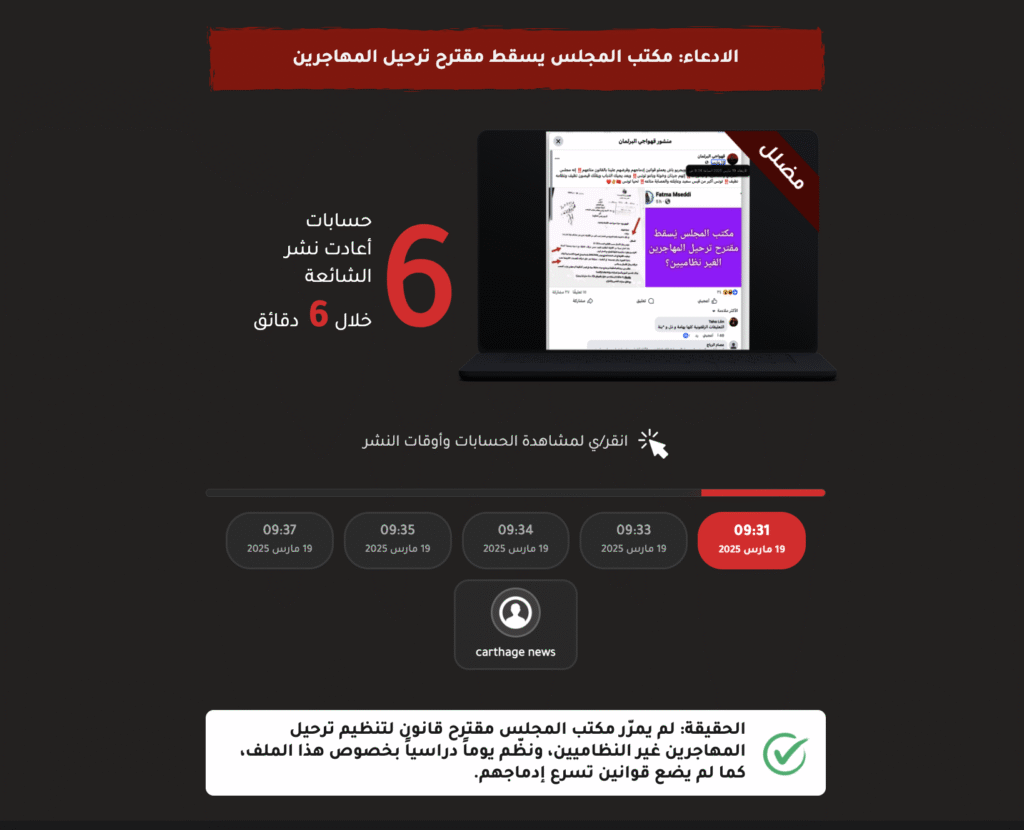 من خلال تتبع الحسابات، لاحظنا وجود عدد كبير من المنشورات المتماثلة أو المتشابهة، كانت تُنشر بأوقات شبه موحدة، ومن ضمن هذه المنشورات ما نشر حول إسقاط البرلمان التونسي مقترح ترحيل المهاجرين، ووضع قوانين لإدماجهم. وبالبحث في حقيقة الأمر، تبين أنه “خاطئ”؛ إذ لم يمرّر مكتب المجلس مقترح قانون لتنظيم ترحيل المهاجرين غير النظاميين، ونظّم يوماً دراسياً بخصوص هذا الملف، كما لم يضع قوانين تسرع إدماجهم.