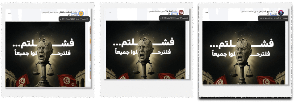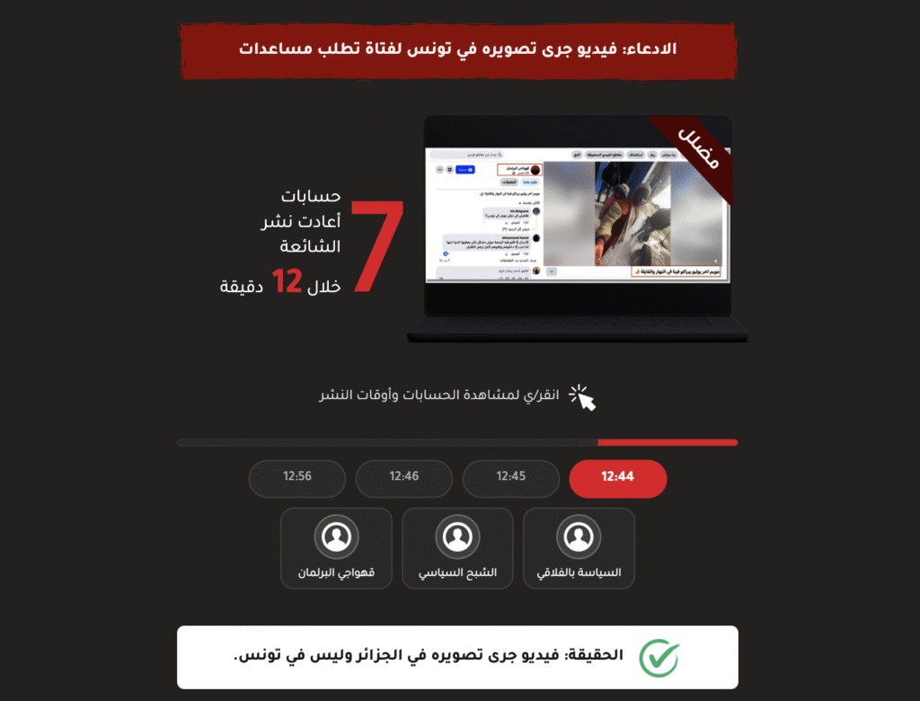 أما في الثالث عشر من نيسان/أبريل، تكرر السيناريو ذاته مع ادعاء “اختطاف طفل في سوسة”، فنشرت سبعة حسابات المحتوى نفسه في المساء ذاته، بين الساعة 21:15 و22:31، رغم أن التحقق أظهر أن الادعاء “غير مثبت”؛ إذ لم نجد أثراً للخبر في أي وسيلة إعلام تونسية، أو حتى في مصادر رسمية حكومية.