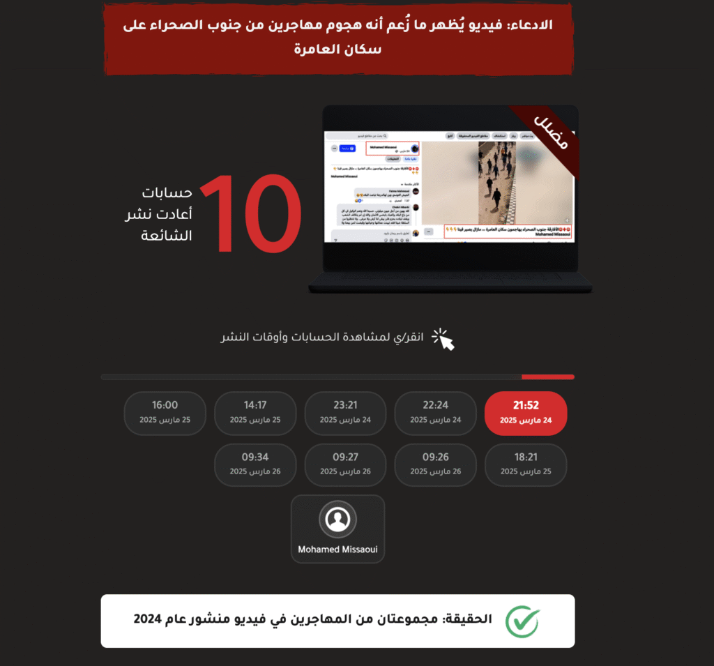 أما الفيديو الثاني الذي قام الحساب بترويجه، فقد نُشر يوم 7 نيسان/أبريل 2025، بعنوان “جندوبة.. كذبة الترحيل.. الأمن يفرق الأفارقة من العامرة نحو المدن.. والأفارقة يعودون للعاصمة والمناطق الساحلية”، وتبين أن الفيديو خاطئ.