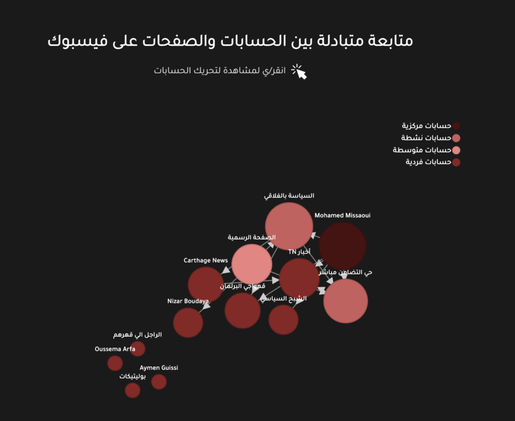 يكشف تتبع شبكة الحسابات طبيعة العلاقات بينها على المنصة؛ على سبيل المثال، نجد أن حساب Mohamed Missaoui يتابع خمسة من الحسابات، هم: الشبح السياسي، وأخبار TN، والسياسة بالفلاقي، وحي التضامن مباشر، وقهواجي البرلمان. أما “الصفحة الرسمية” فتتابع ثلاثة حسابات هي: حي التضامن مباشر، والسياسة بالفلاقي، وNizar Boudaya، لكن لم يتابعها أي حساب من القائمة بالمقابل.