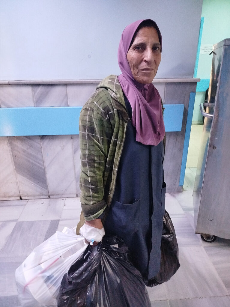 ورغم المخاطر التي تحيط بعمل عائشة، تبدو مهمة بعض زميلاتها في غرف العمليات أكثر خطورة؛ فهنّ على تماس مباشر مع أدوات الجراحة والحقن وبقايا الشاش، ويتعين عليهن جمع أكياس القمامة داخل غرف العمليات، وإزالة الأغطية المستخدمة أثناء الجراحة. ويؤدين هذا العمل وهنّ يرتدين قفازات عادية خفيفة، ولباساً بسيطاً يشبه زيّ الأطباء في العمليات، إلى جانب قناع عادي غير مبطّن.