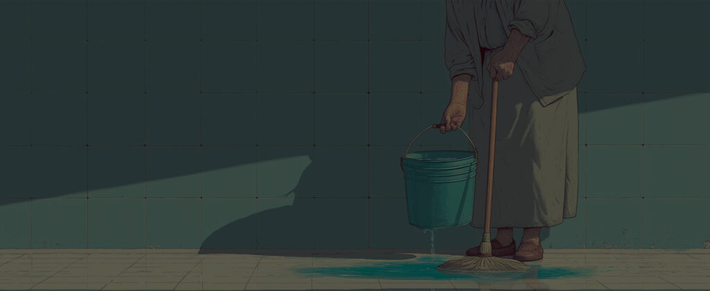 عند الثامنة صباحاً، تستيقظ بوجه شاحب وظهر منحنٍ وجسد أنهكه السرطان، مستأصلاً ثدييها. ومع ذلك، تمضي إلى عملها في حمّامات العيادات الخارجية، رغم ما أصابها من تعب منهك. تمسك بيدها المتورمة ممسحة مغموسة بالكلور، بلا قفازات تحمي جلدها ولا كمامة تقيها الأبخرة.