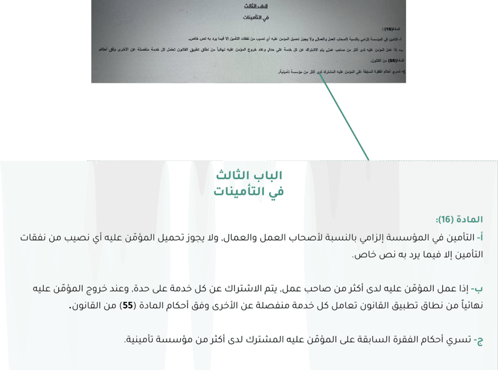 يشير الدكتور محمد هاشم، مدير الصحة والسلامة المهنية في المؤسسة العامة للتأمينات الاجتماعية، إلى أن مرضى السرطان يُعاملون وفقاً للمرسوم 346 لعام 2006 الخاص بالأعمال الشاقة والخطرة. ويوضح أنه إذا ثبت ارتباط الإصابة بالسرطان بطبيعة المهنة، يُسرَّح العامل تسريحاً صحياً مع احتفاظه بحقوقه التأمينية. وبناء على ذلك، لو شُخّصت إصابة عائشة طبقاً للمرسوم كـ”سرطان مهني” فيجب أن تحصل على تسريح صحي، يضمن لها حقوقاً تأمينية تكفل لها حياة كريمة”.