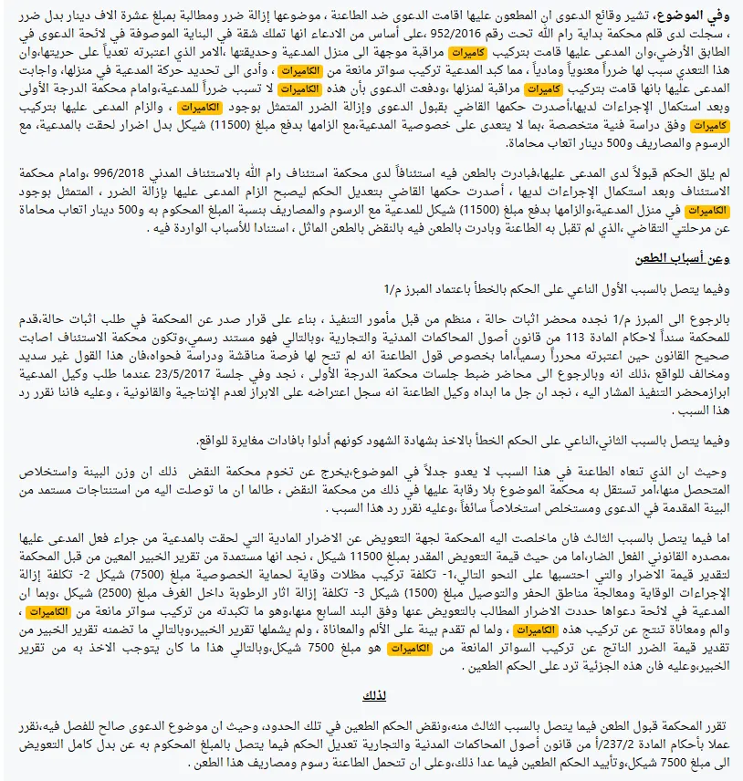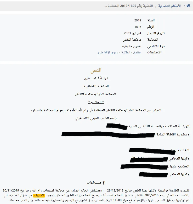 قرار المحكمة العليا الفلسطينية في القضية المرفوعة من قبل فتحية رشيد بخصوص كاميرات المراقبة الموجهة نحو منزلها