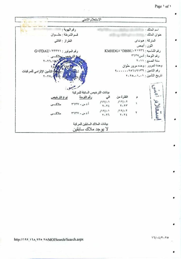 استعلام أمني من إدارة المرور في حلوان، يفيد بحصول طه عبد الحكم والد الطفل (ع. ط) على سيارة المعاقين
