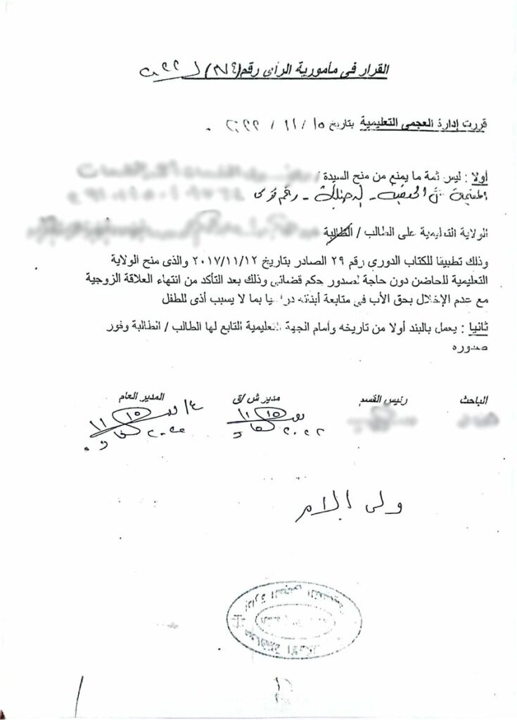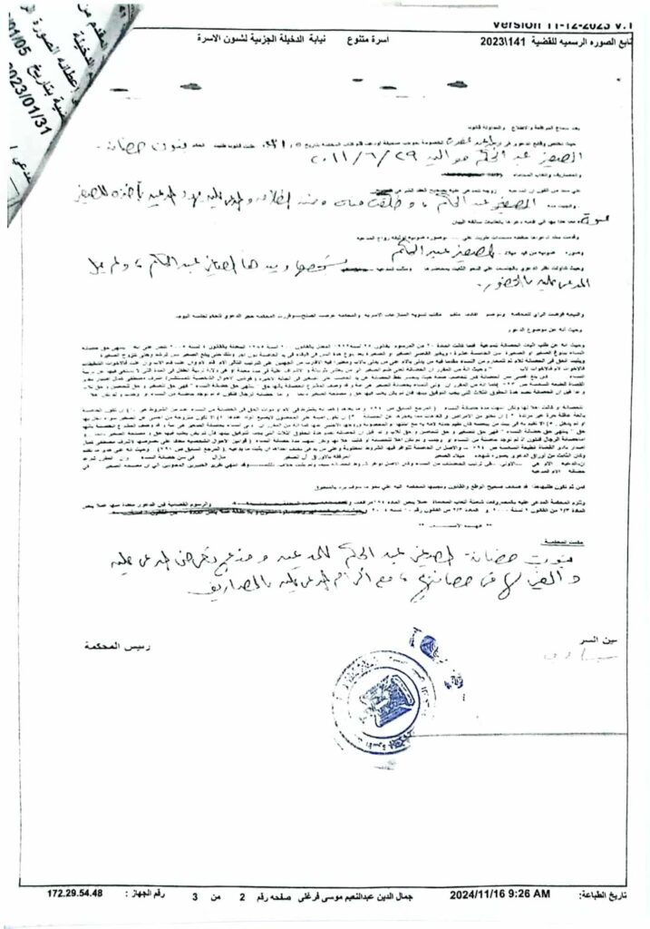 بعد تحرير بلاغ بفقدان البطاقة، حصلت على بدل فاقد في 23 تموز/يوليو 2025، لكن الأب احتفظ بالبطاقة الأصلية ويستخدمها بشكل غير قانوني. وفي تشرين الثاني/نوفمبر 2025، قدمت بلاغاً للخط الساخن 16000 برقم 114205 بشأن استيلاء الأب على حقوق ابنها.