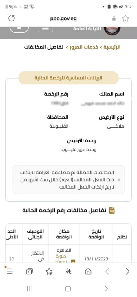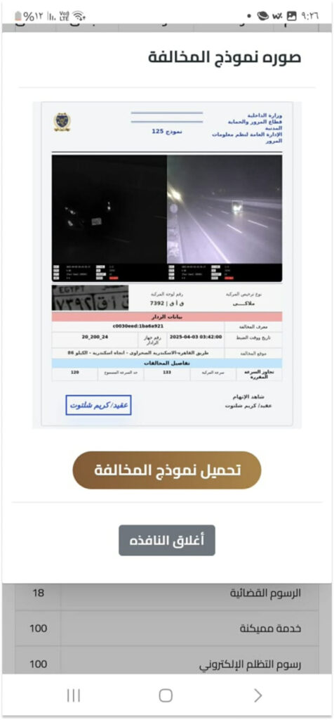 صورة مخالفة مرورية صادرة للسيارة المملوكة للطفل (خ. أ) فهمي
